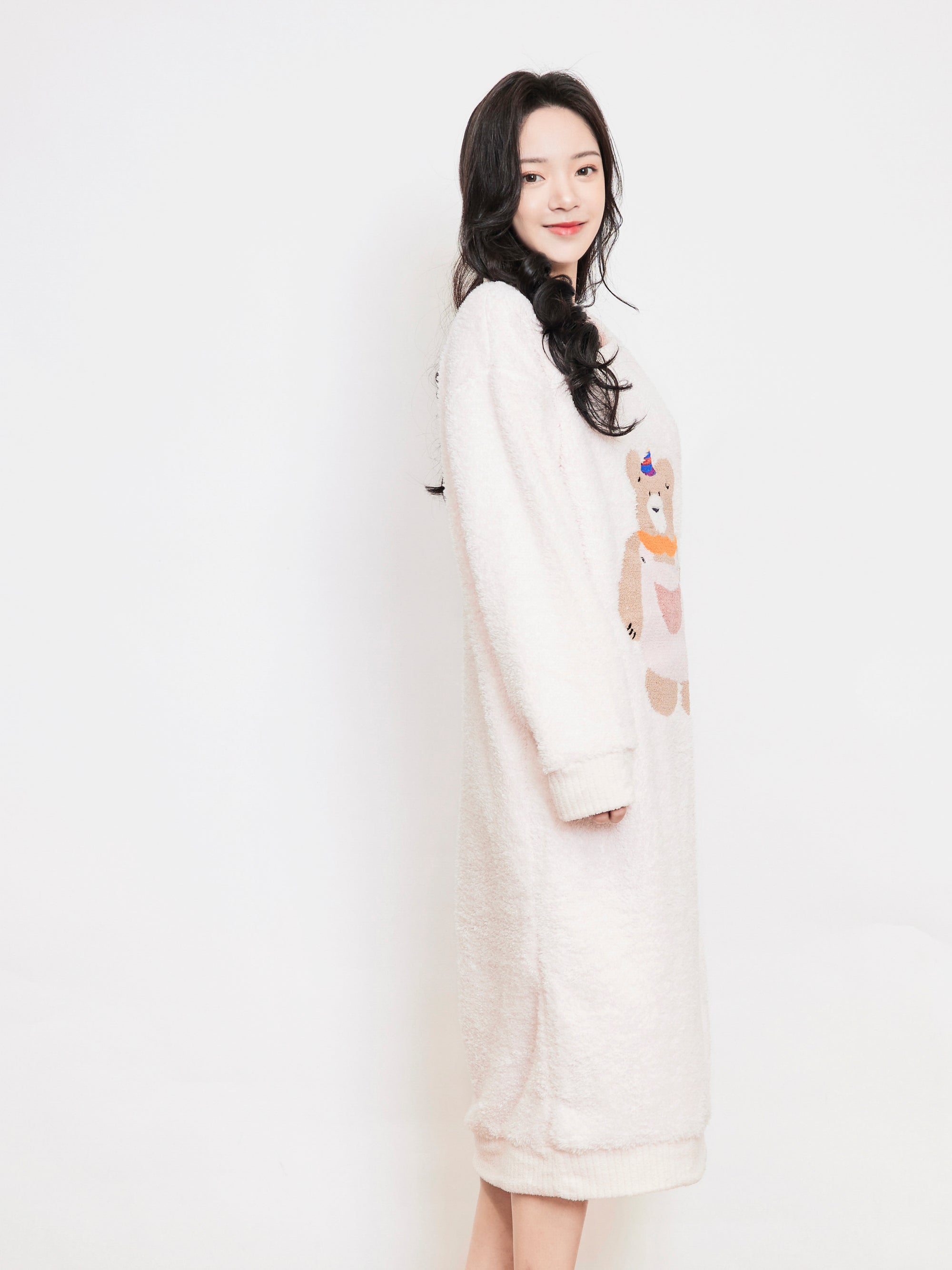 This light pink nightgown is made from soft and fluffy coral fleece material, with a touch as delicate and warm as clouds. The playful party bear design on the chest, wearing a colorful party hat and pink apron, is full of childlike charm and joyful vibes. The loose, long design is both comfortable and adorable.